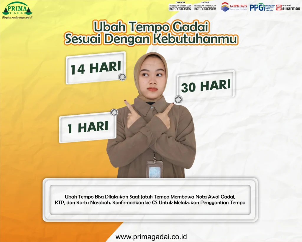 Mengubah tempo pinjaman di Prima Gadai agar sesuai dengan kebutuhan nasabah bisa menjadi solusi fleksibel yang sangat membantu, terutama bagi anda yang mengalami perubahan situasi keuangan.  Ubah tempo bisa dilakukan saat jatuh tempo dengan membawa Surat Bukti Gadai yang berlaku berikut Kartu Nasabah dan identitas anda. Konfirmasikan ke Customers Service Prima Gadai tempat anda menggadaikan barang untuk segera diproses pergantian temponya.